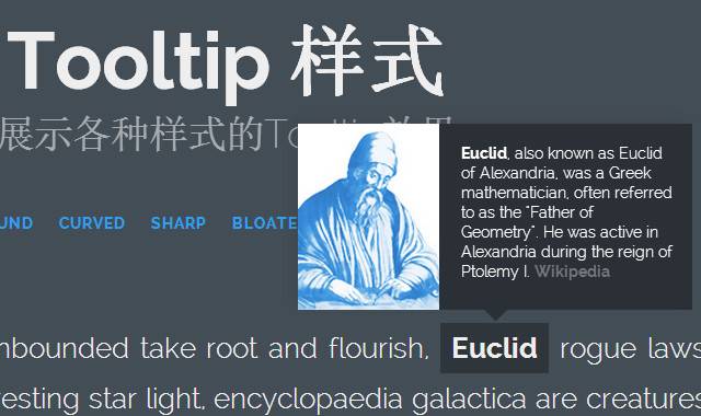 这个炫酷tooltip工具提示插件将带您离开黄底黑字的htmltooltip原始时代。该tooltip插件共9种效果,使用html5svg和css3transform属性完成。这个工具提示效果带图片带动画,效果一流。