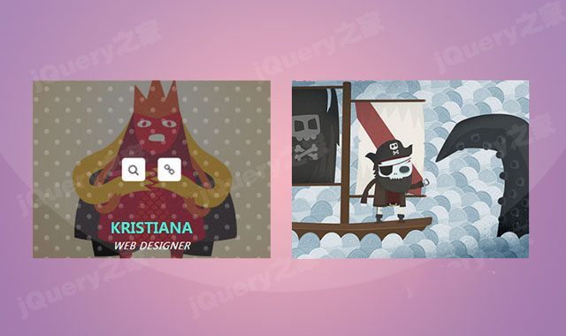 这是一款css3鼠标经过动画特效。在该特效中,当鼠标经过图片时,图片略微放大,底部遮罩层出现,同时图片的描述文字和链接会以动画的方式出现在遮罩层之上,非常炫酷。