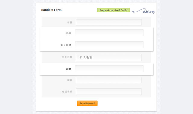 这是一款使用html5和css3制作的表单必填字段美化效果插件。该表单美化插件共有3种效果:必填字段背景高亮效果、必填字段隐藏效果和必填字段3d效果。