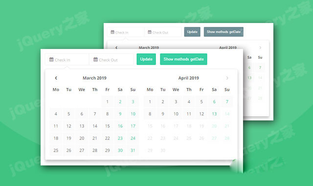 t-datepicker是一款jQuery酒店类入住日期时间范围选择器插件。该jquery日期选择器提供多个配置参数和方法,可以创建响应式的、灵活的、多种主题效果的日期范围选择器。