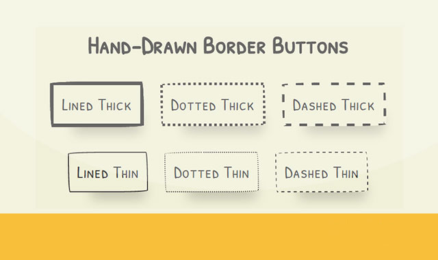 这是一组非常有趣的纯CSS3手绘风格卡通按钮设计效果。这组手绘风格按钮共6种不同的效果,它们以手绘涂鸦的方式,以不同的按钮边框线条宽度和虚线来构成按钮,效果非常不错。