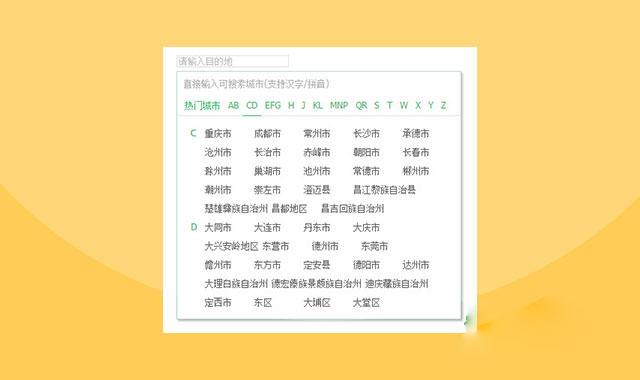 这是一款非常实用的中国各大城市和县区快速选择js插件。通过该插件,用户可以在输入框中通过点击生成包含中国各个城市的下拉列表,进行快速选择、用户还可以在输入框中键入城市的首字,进行快速定位。