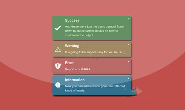 jquery.toast.js是一款可自由配置的jQuery消息提示框插件。该消息提示框可以自定义背景和前景色,提示框的位置,提示框的显示时间,提示框的动画效果等。
