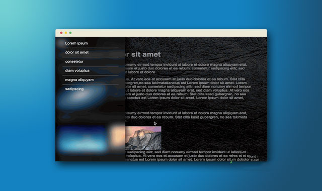 blurry-menu是一款效果非常酷的HTML5Canvas和jQueryUI模糊隐藏侧边栏特效。该侧边栏特效可以将它下面的HTML元素进行模糊处理。模糊效果是动态加入的,任何在侧边栏下方的HTML元素都将被模糊。