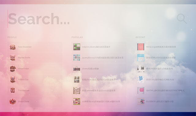 这是一款新颖的html5搜索框样式。当用户点击搜索框后搜索框变形放大到全屏,上部分是一个大的搜索框,下部分列出用户可能感兴趣的内容。搜索框的动画代码采用css3完成。