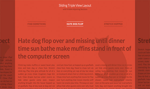 这是一款时尚的html5页面布局效果。这个html页面布局将文章设定为不同的面板,在屏幕的可见区域有三个面板,左右两侧的小面板可以点击然后滑动显示上面的文章,也可以通过导航按钮来滑动面板。