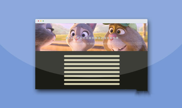这是一款使用纯CSS3制作的炫酷响应式页面顶部滚动视觉差特效。该特效在页面向下滚动时,页面顶部的图片和正文的内容形成视觉差效果,非常炫酷。
