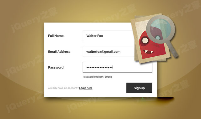 这是一款带视觉特效的js密码强度检测特效。该特效在用户输入密码的时候,随着密码强度的增强,旁边的图像会越来越清晰或越来越模糊,通过图像的变化来提示用户密码的强度。