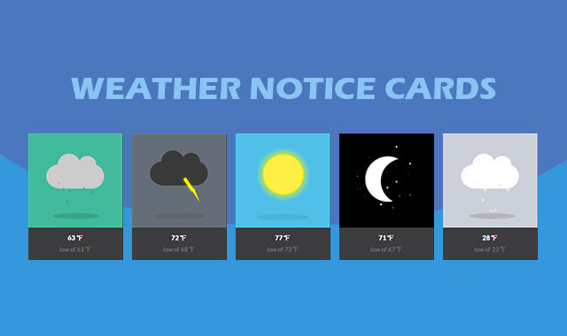 这是一款非常有意思的纯CSS3扁平风格天气预报卡片动画特效。该天气预报特效将各种天气制作为卡片形式,包括下雨,闪电,白天,夜间和下雪。卡片使用扁平化风格,并使用CSS3帧动画来制作各种动画效果。